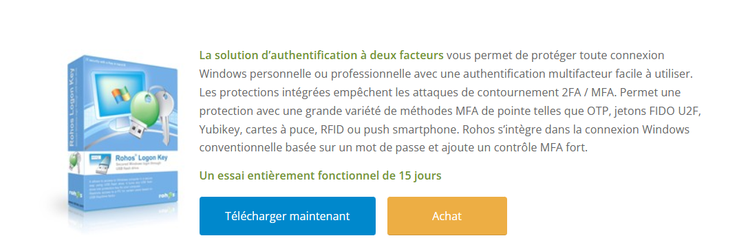 Pour télécharger l'application et acheter une licence, cliquez sur le lien suivant :Rohos Logon Key – Rohos